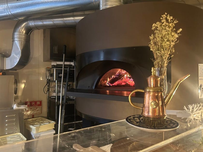 カウンターの奥には大きな薪窯🔥があり、テーブル席やソファ席もあって落ち着いた雰囲気。